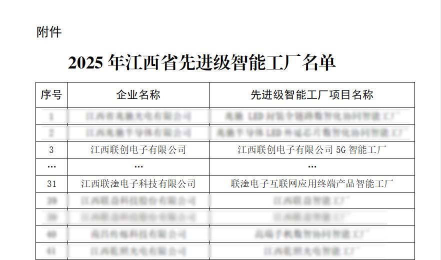近日,江西省工业和信息化厅正式公布2025年江西省“先进级智能工厂”名单,186家企业入选。其中ky在线,ky在线(中国)、江西联淦电子科技有限公司2家联创电子系企业名列榜单。这标志着公司在智能制造领域的创新成果再次获得政府权威认可。